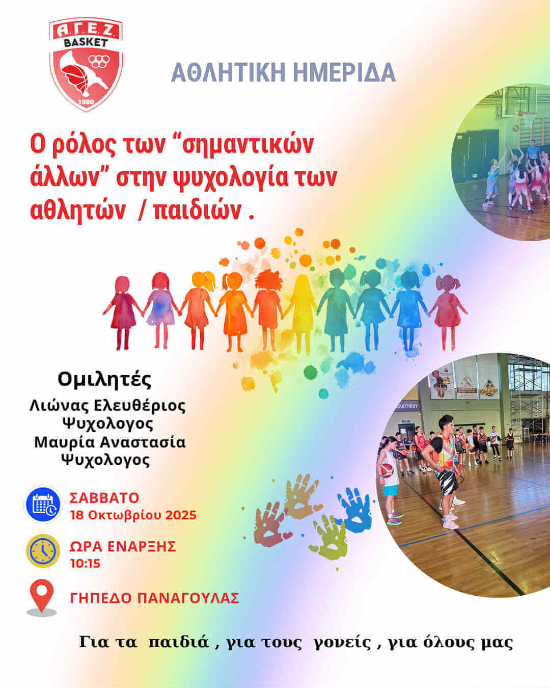 Ο σύλλογος μας προχωράει στην διεξαγωγή της πρώτης του αθλητικής ημερίδας για φέτος με τίτλο: «Ο ρόλος των «σημαντικών άλλων» στη ψυχολογία του παιδιού/αθλητή»