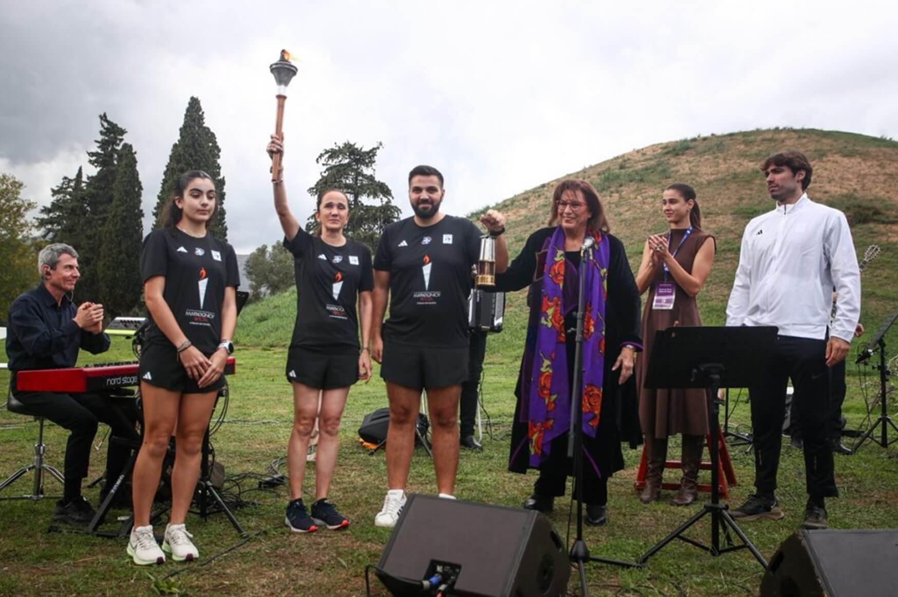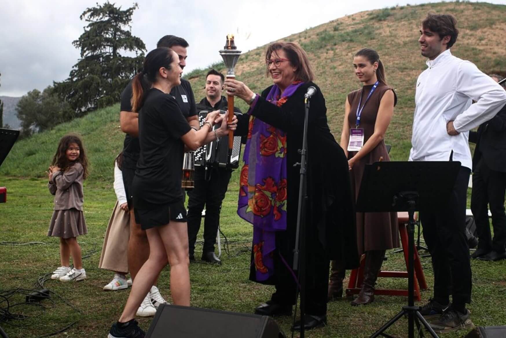 Στη συνέχεια, η μούσα του μεγάλου δημιουργού παρέδωσε τη φλόγα στους πρώτους λαμπαδηδρόμους: τον Γρηγόρη Λαμπράκη τον νεότερο, που φέρει το όνομα του αγωνιστή παππού του, και την πρώην πρωταθλήτρια του Μαραθωνίου Μάγδα Γαζέα, η οποία είχε στο πλευρό της την κόρη της, Βασιλική Ακτύπη.